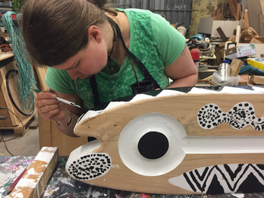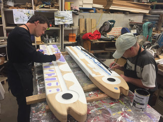 So after the wonderful Richard Van Bremen of Cartwright Woodworkers donated his time and energy machine cutting the Inanga forms the guys got to work painting the true to colour and design patterns on the Pou (totems)